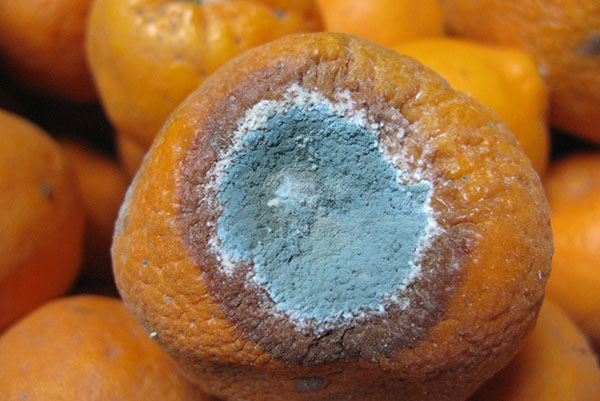 从各种伤口,特别是采收、运输、加工过程中造成的伤口侵入,最初在果面上出现水渍状淡褐色圆形病斑,迅速扩展,病斑中央表面先长出白色霉状物(菌丝),霉层很快加厚,渐变灰蓝色或灰青色霉层,并不断向周围扩大蔓延并加厚,外缘菌丝环较窄,且松散,约1-2mm,呈粉状。并不边缘水渍状,规则而明显。其腐烂速度较慢,腐烂较慢,病部不易与包裹纸或其它接触物粘结,散发窒息的霉味。